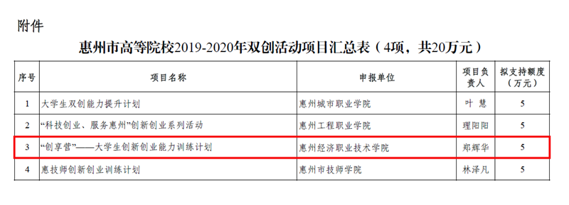 近日,从惠州市科学技术局获悉,我校学工部郑辉华老师撰写的《“创享营”——大学生创新创业能力训练计划》获批通过惠州市高等院校2019-2020年双创活动项目申报。
