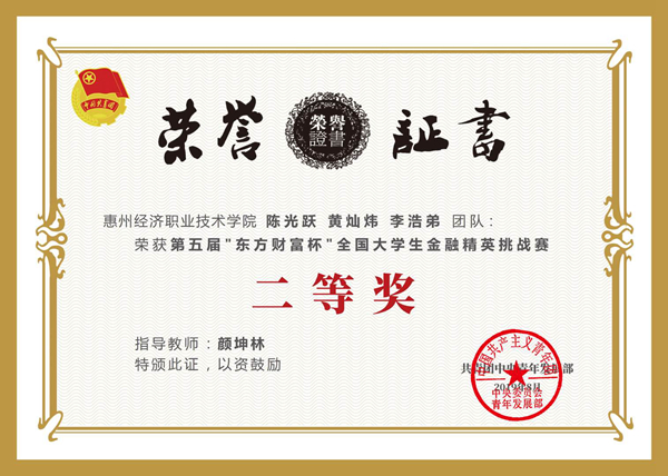 近日,从第五届“东方财富杯”全国大学生金融挑战赛组委会获悉,我校财经学院金融专业学生陈光跃、黄灿炜、李浩弟团队荣获第五届“东方财富杯”全国大学生金融精英挑战赛二等奖。该学生团队由金融系主任颜坤林担任指导教师。