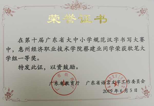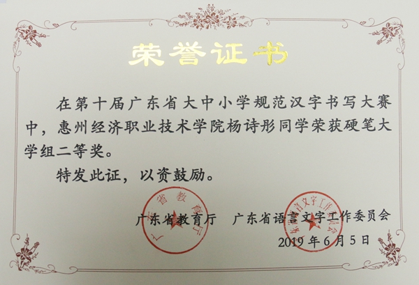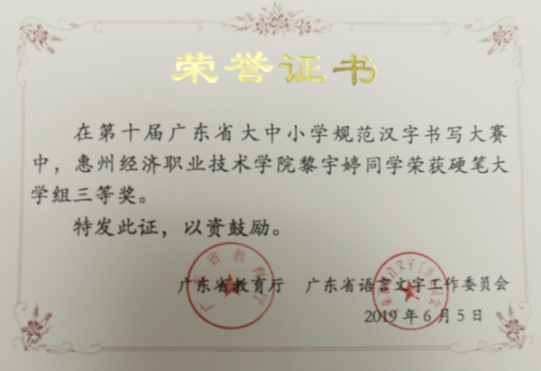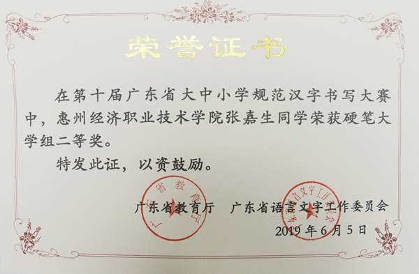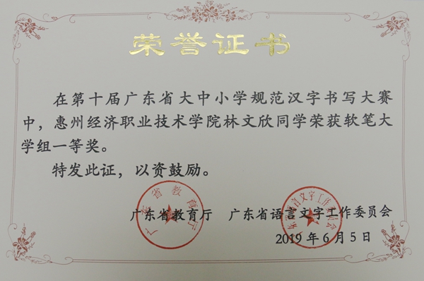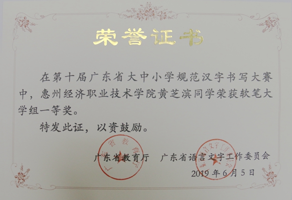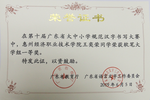 近期,由广东省教育厅和广东省语言文字工作文员会主办的第十届广东省大中小学规范汉字书写大赛拉下帷幕,在此次大赛中,由我校方凡、罗宇老师指导的王奕荣、林文欣、黄芝滨、蔡建业四位同学分获软笔书法一等奖,张嘉生、杨诗彤两位同学分获硬笔书法二等奖,黎宇婷同学获硬笔书法三等奖。
