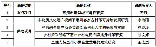 近日,从《关于公布惠州市哲学社会科学规划2019年度获准立项项目的通知》(惠社科规划〔2019〕2号)获悉,我校共有5个项目获批立项,其中高燕的《惠州创新型城市建设研究》获得重点项目立项,李海燕、林继玲、甘文婷和王宏道的项目获共建项目立项,具体如下: