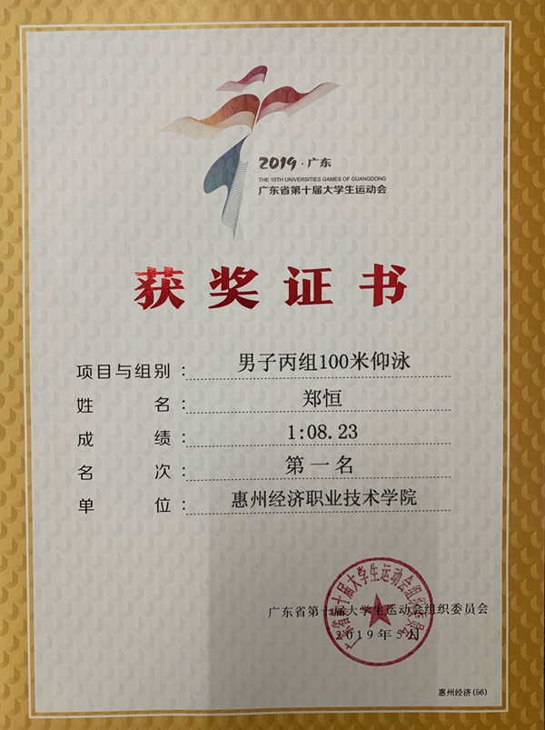 我校健儿首次参加游泳项目,郑恒同学以1:08.23的成绩斩获男子丙组100米仰泳第一名,并打破了广东省大学生运动会丙组纪录,这是我校运动队首次打破省大运会纪录,郑恒同学还获得50米蝶泳第三名。梁德辉同学分别获得50米、100米自由泳第三名和第六名的好成绩。