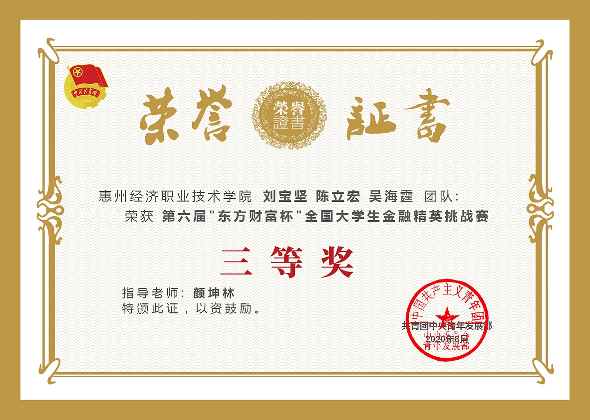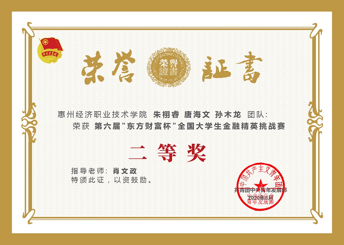 近日,从第六届“东方财富杯”全国大学生金融挑战赛组委会传来喜讯,由我校财经学院副院长颜坤林指导的魏小崇、黄嘉怡、曾文婷团队荣获大赛二等奖; 肖文政老师指导的朱栩睿、唐海文、孙木龙团队荣获二等奖;颜坤林老师指导的刘宝坚、陈立宏、吴海霆团队荣获三等奖。