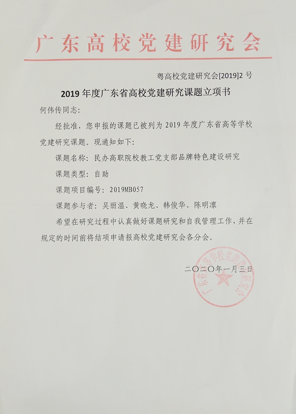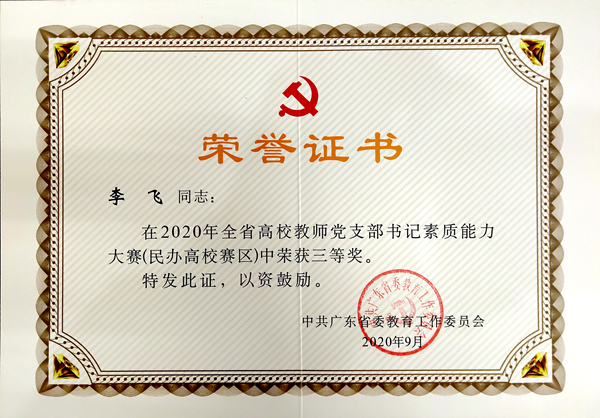 2020年以来,我校在广东省高校党建研究会民办院校分会的各项工作中取得了可喜成绩。在年会论文评比中,我校工商学院黄美英老师和马克思主义学院李贺老师撰写的论文均获三等奖;在全省高校教师党支部书记素质能力大赛(民办高校赛区)中,旅游学院李飞老师获得三等奖;在广东省高校党建研究会课题中,财经学院何伟传老师负责的党建课题获得立项。