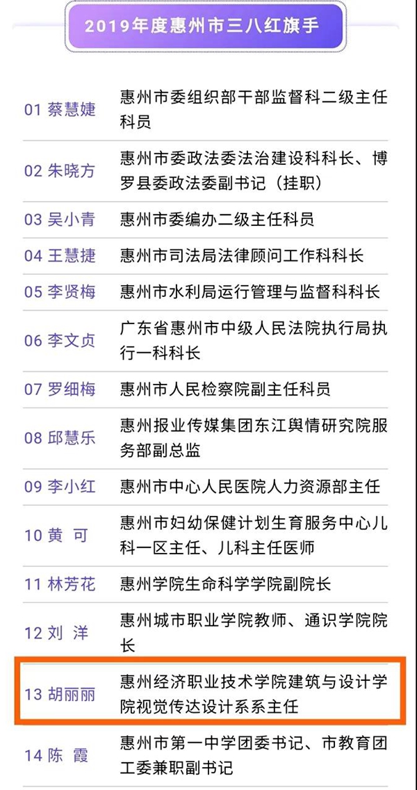 近日,从惠州市妇女联合会获悉,我校教研与校企合作部被授予2019年度惠州市“巾帼文明岗”荣誉称号,建筑与艺术设计学院胡丽丽老师被授予2019年度惠州市“三八红旗手”荣誉称号。