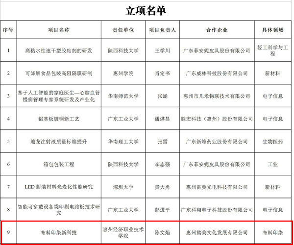 近日,教育部科技发展中心公布了第二批“蓝火计划”(惠州)产学研联合创新资金项目立项名单,我校建筑与艺术设计学院与惠州鹅美文化发展有限公司、深圳市良益达数码纺织技术有限公司合作申报的“布料印染新科技”项目成功立项,并获得项目资助20万元。该项目是继信息工程学院2018年获得“蓝火计划”项目立项后我校第二个成功立项项目。