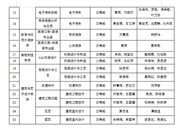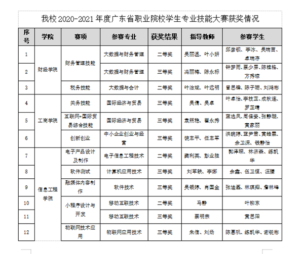 2021年3月-5月期间,我校教务处组织各专业师生参加由广东省教育厅主办的2020-2021年度广东省职业院校学生专业技能大赛。为了让学生技能有进一步提高,各学院认真组织竞赛选拔和集训,参赛师生通过线上、线下相结合的方式认真备赛,教师悉心指导,学生刻苦训练,为获得佳绩奠定了基础。本次大赛我校共获得25个奖项,其中,二等奖5项、三等奖20项。