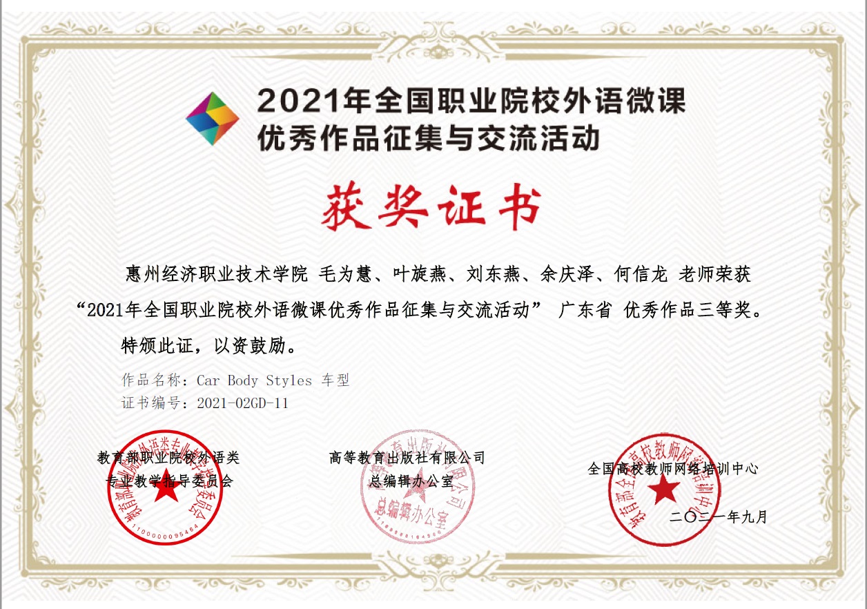 近期,在“2021年全国职业院校外语微课优秀作品征集与交流活动”中,我校毛为慧、叶旋燕、刘东燕、何信龙等老师的作品获广东省优秀作品三等奖。